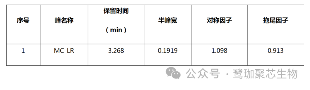 图3. 微囊藻毒素LR 20μg/mL标准溶液色谱图 表1. 微囊藻毒素LR峰表信息