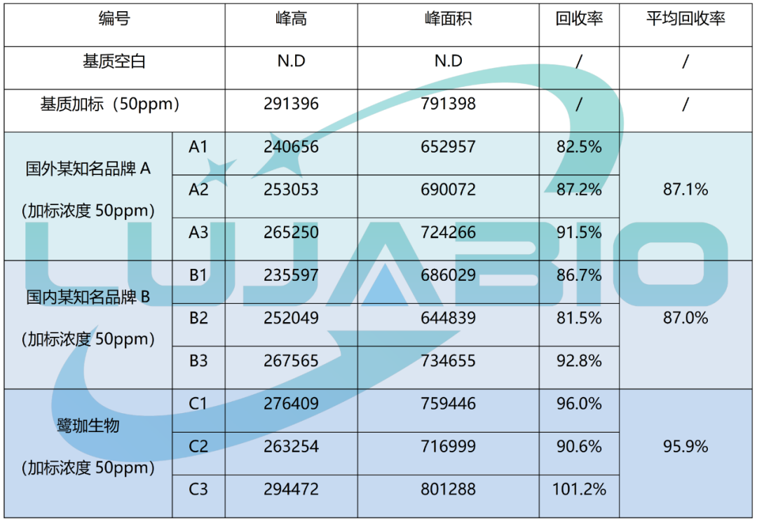 图1. 氯霉素化学结构式 针对氯霉素样品的前处理方法,鹭珈生物推出LUJACap HLB(200mg/6mL)比对美国某知名品牌A和国内某知名品牌B的HLB产品,实验结果表明鹭珈生物的LUJACap HLB完全满足对氯霉素的富集,整体回收率较好。实验详情如下。 参考方法:《NY/T 3787—2020土壤中四环素类、氟喹诺酮类、磺胺类、大环内酯类和氯霉素类抗生素含量同步检测方法 高效液相色谱法》